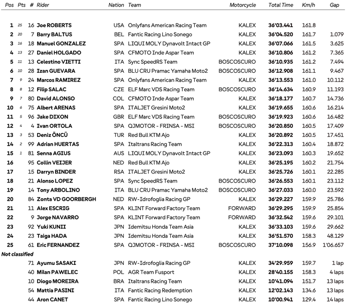 Трети зад тях завърши лидерът в генералното класиране Мануел Гонсалес, който просто нямаше отговор за темпото на двамата лидери. Испанецът обаче си тръгва доволен от Чехия, тъй като неговите най-близки преследвачи в спора за титлата Арон Канет и Диого Морейра отпаднаха. Канет падна още в първия завой и малко по-късно се прибра в бокса, а Морейра тръгна от алеята пред боксовете, но след тежкото си падане в квалификацията вчера просто не се чувстваше комфортно върху машината си и се прибра в бокса още преди средата на дистанцията от 18 обиколки.