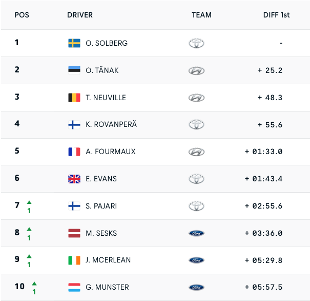В неделното класиране най-бърз беше Солберг, който завърши на 4.0 пред Рованпера и на 4.1 пред Танак. Еванс и Нювил бяха другите двама пилоти, които влязоха в топ 5 на класирането от неделния ден, изоставайки със съответно 13.0 и 13.2 от Солберг. В пауърстейджа най-бърз беше Рованпера, който изпревари Танак, Солберг, Нювил и Еванс, които оформиха зоната на точките.