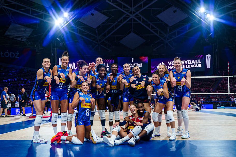 Олимпийският шампион Италия стана първия полуфиналист в тазгодишната Волейболна Лига на нациите при жените. Момичетата на Хулио Веласко, които са настоящите победителки в комерсиалната надпревара, надиграха категорично САЩ с 3:0 (25:22, 25:21, 28:26) в първия 1/4-финал от финалния турнир на Лигата, игран тази вечер пред около 4000 зрители в зала "Атлас Арена" в Лодз (Полша).