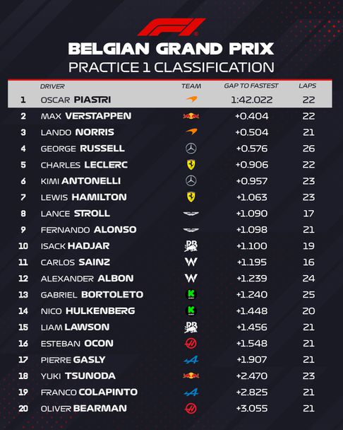 Лидерът в генералното класиране във Формула 1 Оскар Пиастри зададе темпото в единствената свободна тренировка преди 13-ия кръг за сезон 2025 – Гран При на Белгия.