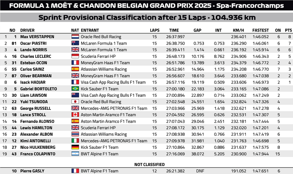 Зад Норис Леклер се класира на четвъртата позиция, от която и стартира, а точки от спринта в Белгия взеха още Естебан Окон, Карлос Сайнц, Оливър Беарман и Исак Хаджар. Като цяло в спринта нямаше големи промени в подреждането спрямо резултата от квалификацията. Единствено повредата на Пиер Гасли, който трябваше да стартира осми, позволи на всички пилоти зад него да напредната с една позиция още преди старта. Част от тях спечелиха по още една позиция, но като цяло големи размествания не настъпиха, тъй като се образуваха доста дълги DRS влакчета.