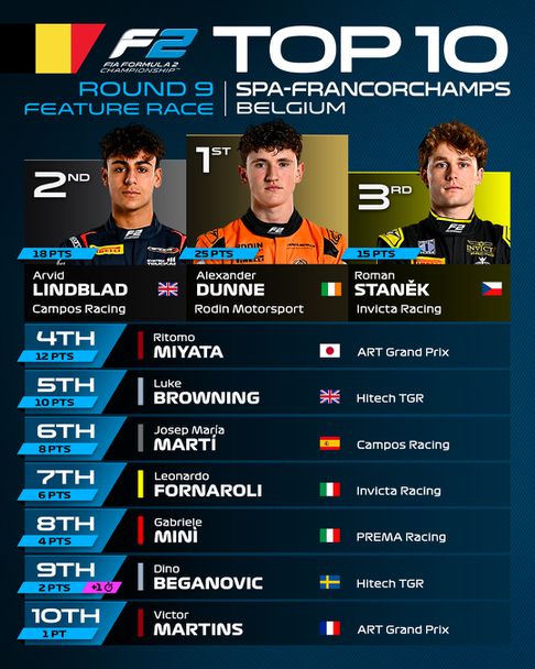 Алекс Дън спечели своята трета победа за сезона във Формула 2, след като триумфира в дъждовното основно състезание на пистата „Спа“ в Белгия.