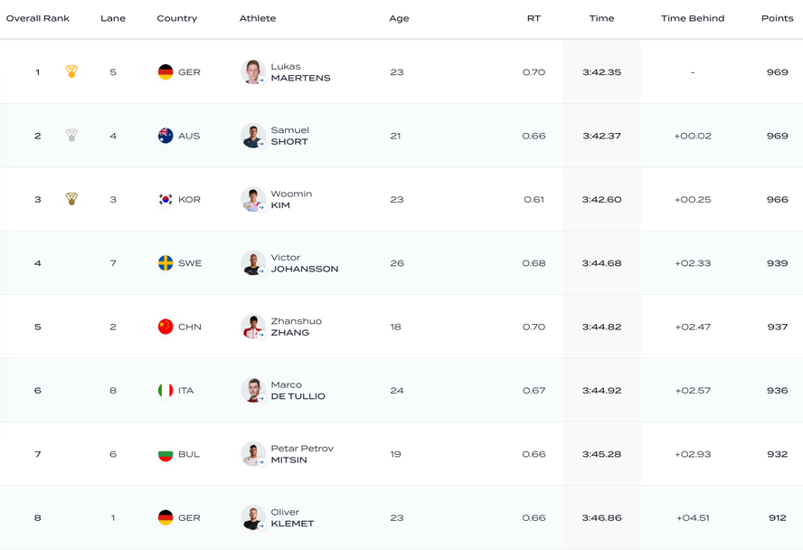 Впоследствие обаче силите на Мицин привършиха и той започна да губи позиции, като в крайна сметка финишира на седмото място с време от 3:45.28 и пасив от 2.93 секунди спрямо шампионат Мартенс. Втори на само 0.02 зад германеца остана Самуел Шорт от Австралия, а тройката с пасив от 0.25 оформи представителят на Южна Корея Ким Уумин.