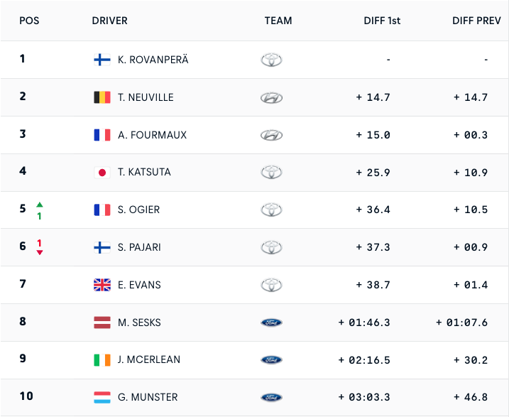 Младият финландец има пасив от 0.9 спрямо осемкратния световен шампион и преднина от 1.4 пред петия пилот на Тойота – Елфин Еванс. На повече от минута зад уелсецът се движи и Мартинс Сескс, който води атаката на М-Спорт с аванс от 30.2 пред Джошуа Макърлийн, а на още 46.8 зад него е и Грегоар Мюнстер.