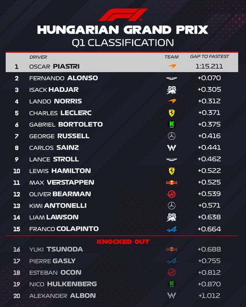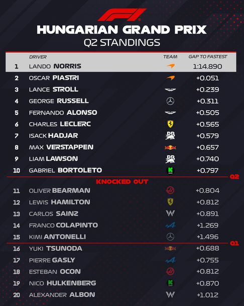 Зад британеца пети и шести ще стартират съотборниците в Астън Мартин Фернандо Алонсо и Ланс Строл, а седми и осми на старта ще застанат Габриел Бортолето и Макс Верстапен. Пилотите на Рейсинг Булс Лиам Лоусън и Исак Хаджар ще оформят челната десетка на стартовата решетка на пистата „Хунгароринг“ утре.