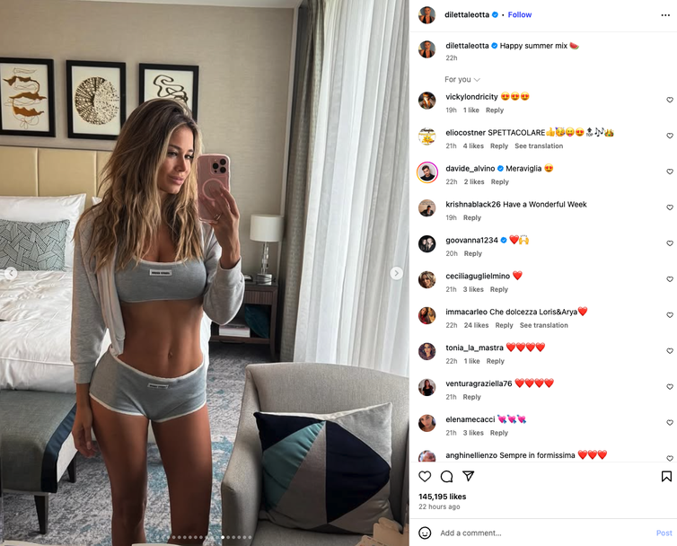 Спортната журналистка Дилета Леота зарадва своите 9.3 млн. последователи в Инстаграм с нова доза снимки. Повечето от тях са семейни, но измежду тях блестят и няколко доста секси кадъра, които няма как да бъдат подминати от мъжката аудитория.