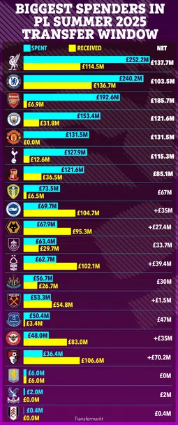 Арсенал е клубът от Премиър лийг с най-големи нетни разходи по отношение на лятната селекция до момента. “Топчиите” привлякоха Мартин Субименди, Нони Мадуеке, Виктор Гьокереш, Кристиан Москера, Кристиан Ньоргор и Кепа Арисабалага за общо 192,6 милиона паунда, но до момента са получили само 6,9 милиона от продажбите на Нуно Тавареш и Маркиньос. Така нетните разходи за лятна селекция на Арсенал възлизат на 185,7 милиона паунда според данните на Transfermarkt.