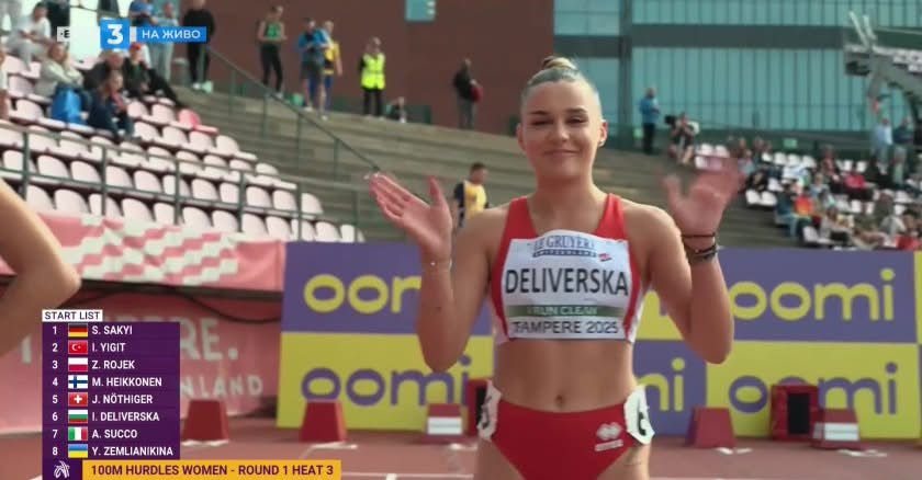 Ива Деливерска намери място на полуфиналите на 100 метра с препятствия на европейското първенство по лека атлетика за младежи и девойки до 20 години в Тампере. Българката завърши четвърта в своята серия, като записа време 13.87 секунди, което и осигури директно класиране за полуфиналите.