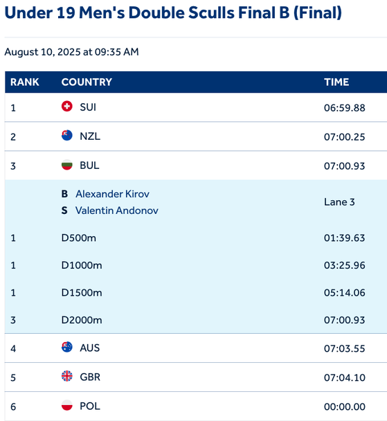 Двойката скул на България Александър Киров и Валентин Андонов завърши на 9-о място в крайното класиране на Световното първенство по гребане за юноши и девойки в Тракай (Литва).