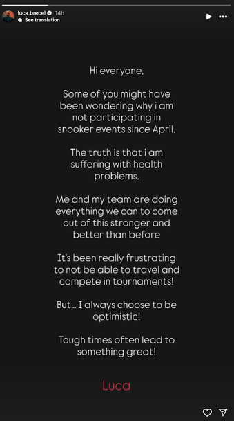 "Някои от вас може би се чудят защо не участвам в снукър събития от април насам. Истината е, че имам здравословни проблеми.