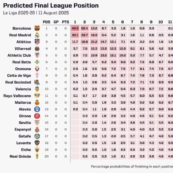 Доста интересна и прогнозата как ще се развие битката за 4-тото място, което дава право на участие в Шампионската лига. През последните години битката за него е оспорвана до самия край. Атлетик Билбао го зае миналия сезон, следвайки Жирона от сезон 2023/24. За тази кампания Opta определя Виляреал като фаворит за класиране в Шампионска лига с 13,8% шанс. Баските са с 13,2% вероятност да завършат четвърти. В сравнение с миналия сезон, единствената промяна в челната петица е размяната на местата между Атлетик и Виляреал.
