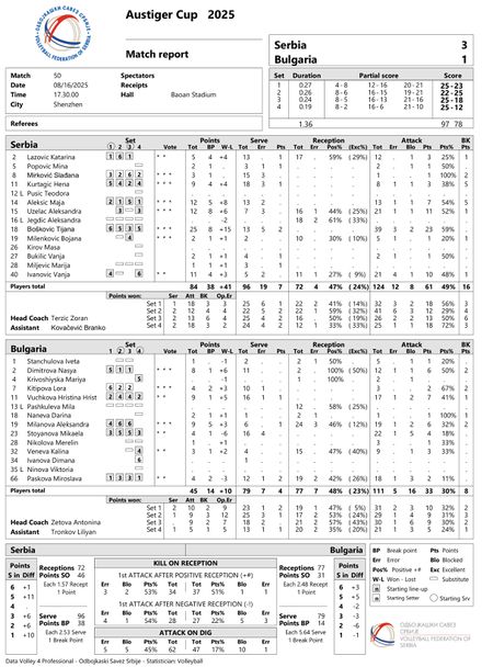 Най-резултатни за България бяха Нася Димитрова и Александра Миланова с по 9 точки. За Сърбия звездата и капитанка на тима Тияна Бошкович бе над всички с 25 точки (5 аса!) за победата.