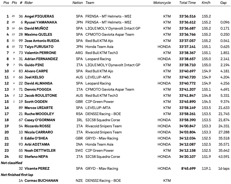 Това доведе до традиционния хаос, който виждаме в Moto3, а в него Пикерас се ориентира най-добре, за да спечели. Испанецът поведе в средата на предпоследния тур, възползвайки се от грешката, която Перон допусна при преминаването на шестия завой.