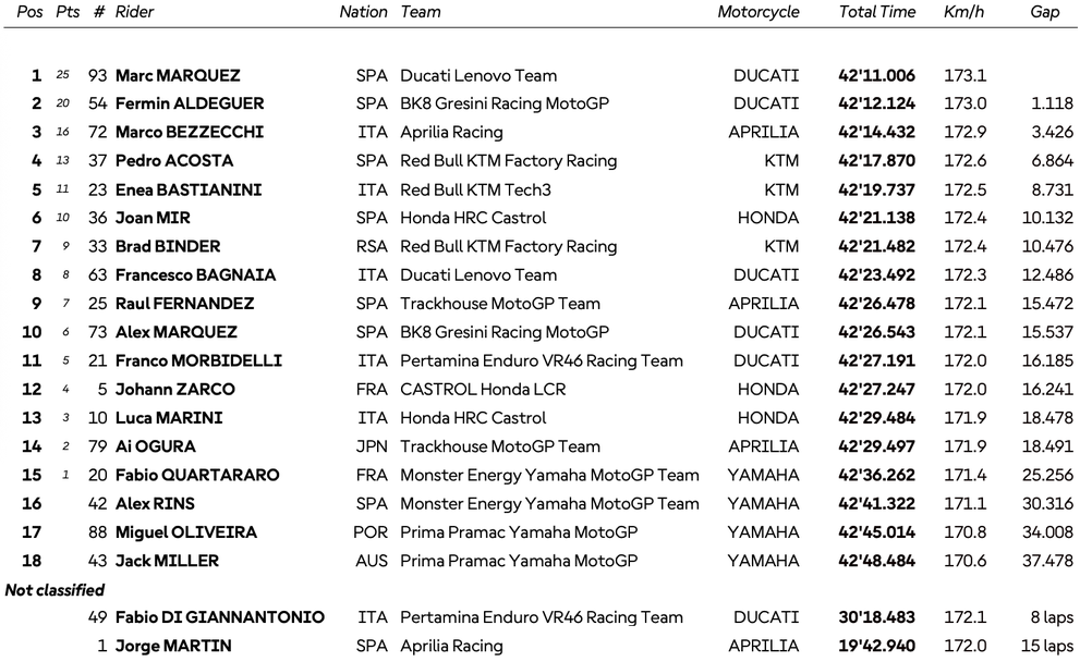 В генералното класиране след първите 13 кръга за сезона Марк Маркес води с актив от 418 точки и аванс от цели 142 пред своя по-малък брат Алекс. Тройката с пасив от 197 пункта спрямо лидера оформя неговият съотборник Баная.