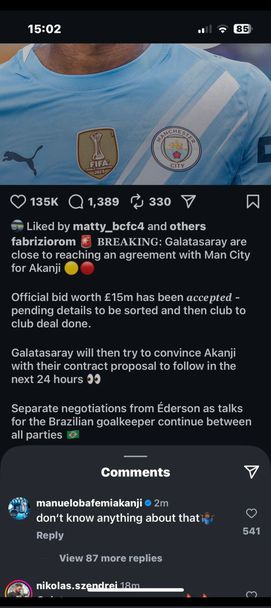 По-рано днес трансферният експерт публикува в Инстаграм, че двата клуба са близо до сделка за швейцарския национал за 15 млн. паунда, както и че турският шампион ще отправи своята оферта към играча в близките часове. Малко след това обаче самият Аканжи остави коментар под поста на Романо, изразявайки своето изумление от тази информация. „Не знам нищо за това“, написа 30-годишният футболист. Впоследствие журналистът изтри публикацията си в Инстаграм, но не и в Х, където все още може да бъде видяна същата новина.