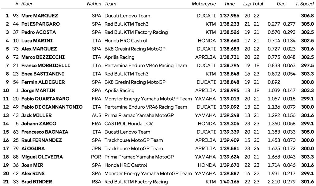 Трети с пасив от 0.570 се нареди Педро Акоста, който се движеше с рекордно темпо в края на втория сектор във финалната си обиколка, но обърка спирането за деветия завой и излетя от пистата, с което турът му беше провален. Зад испанския пилот на КТМ в топ 5 попаднаха още Лука Марини и Алекс Маркес, които завършиха на съответно 0.704 и 0.727 зад Марк Маркес.
