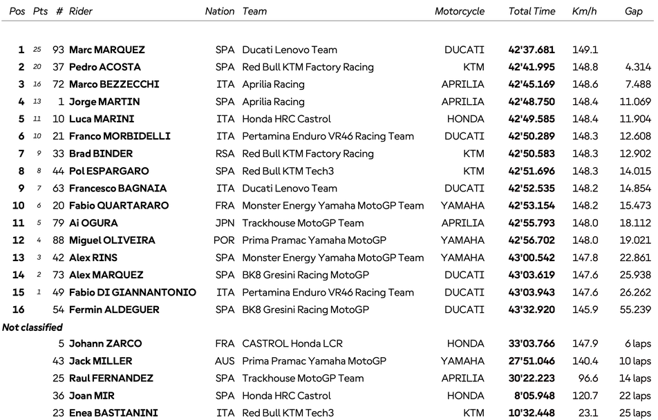 Втори зад него финишира Педро Акоста, който след падането си в квалификацията трябваше да стартира от седмата позиция, но все пак успя да си проправи път до второто място на финала. Подиумът оформи ранният лидер Бедзеки, чието темпо просто не беше достатъчно добро, за да може той да се бори с Маркес и Акоста.