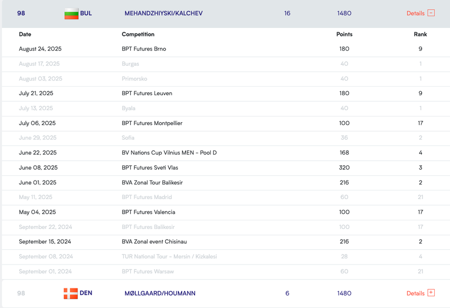 Така най-добрата българска двойка в плажния волейбол се изкачи в Топ 100 на световната ранглиста е вече заема 98-о място с актив от 1480 точки, колкото имат и датчаните Мьолгард и Хоуман.