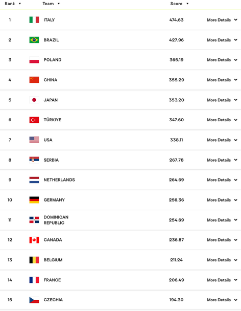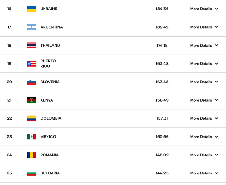 Испания спечели 12.06 точки и се изкачи с една позиция и вече е на 30- място с актив от 130.15 точки.
