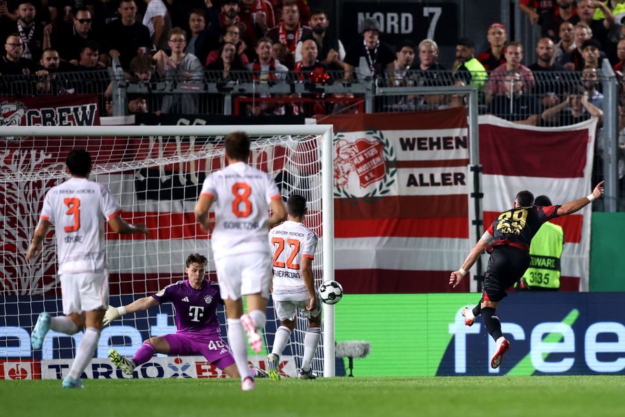 Байерн поведе с попадение на Кейн от бялата точка в 16-ата минута, а Майкъл Олисе в 51-вата сякаш реши всичко в полза на гостите. Последваха две груби грешки в защитата на гранда от Мюнхен, наказани от Фатих Кая. Героичните намеси на вратаря на Веен Флориан Щрицел достигнаха кулминацията си със спасената дузпа на Кейн в 76-ата минута. Английскит нападател обаче се реабилитира при последната атака в двубоя и с глава донесе драматичния успех на Байерн.