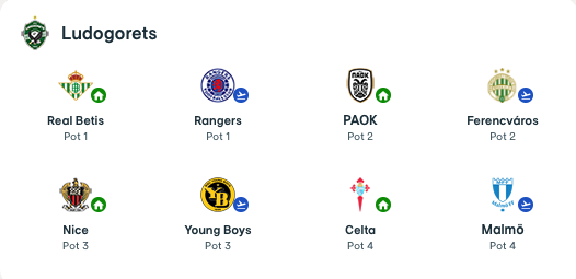 Ето съперниците на Лудогорец: Бетис (д), Глазгоу Рейнджърс (г), ПАОК (д), Ференцварош (г), Ница (д), Йънг Бойс (г), Селта (д), Малмьо (г).