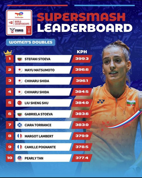 Стефани Стоева е първа в класацията на международната федерация по бадминтон за най-силен смач при жените. Тя обаче не е единствената българка в топ 10 на Supersmash Leaderboard. Нейната сестра Габриела също е сред най-добрите.