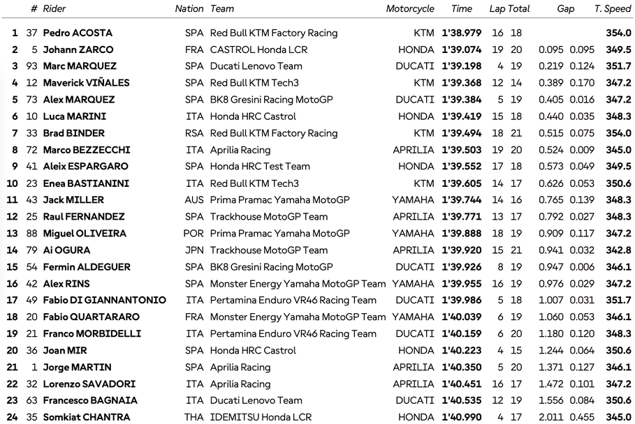 Испанецът успя да запише две обиколки за 1:38.979, които му бяха достатъчно, за да заеме първото място. Втори с пасив от 0.095 секунди се класира Йоан Зарко, чийто най-добър резултат също беше записан с нови гуми в заключителните моменти на 45-минутната сесия.