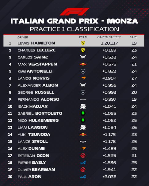 Най-бърз в първите 60 минути за подготовка в Храма на скоростта беше седемкратният шампион Хамилтън, който завъртя обиколка за 1:20.117 с меките гуми на Пирели. По този начин британецът изпревари с 0.169 секунди своя съотборник и миналогодишен победител на „Монца“ Леклер, чийто най-добър резултат също беше записан с меката смес за този уикенд.