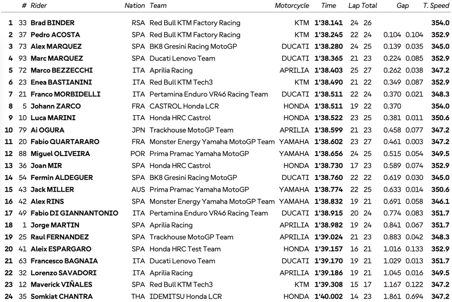 Зад тях директно за втората фаза на квалификацията утре се класираха още Марко Бедзеки, Енеа Бастианини, Франко Морбидели, Йоан Зарко, Лука Марини и Ай Огура, които влязоха в топ 10. Първи извън тази група остана Фабио Куартараро, който беше със само 0.003 по-бавен от Огура и ще трябва да минава през първата фаза на квалификацията, което меко казано не се хареса на световния шампион за 2021 година.