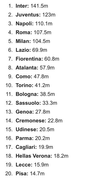 Най-голямо увеличение на заплатите има в шампиона Наполи с 30,7%, следван от Рома (22,3%), Комо (25,4%) и Ювентус (12,6%), докато в Интер и Милан има минимален спад в това отношение с по 0,7% и 0,6%. Въпреки това “нерадзурите” продължават да водят убедително по бюджет за възнаграждения със 141,5 млн. евро, като са следвани от Ювентус (123 млн.), Наполи (110,1 млн.), Рома (107,5 млн.) и Милан (104,5 млн). Така общо в Серия "А" през тази кампания ще се дават заплати в размер на 1,1 млрд. евро, което е с 3,8% повече от сумата за сезон 2024/25.