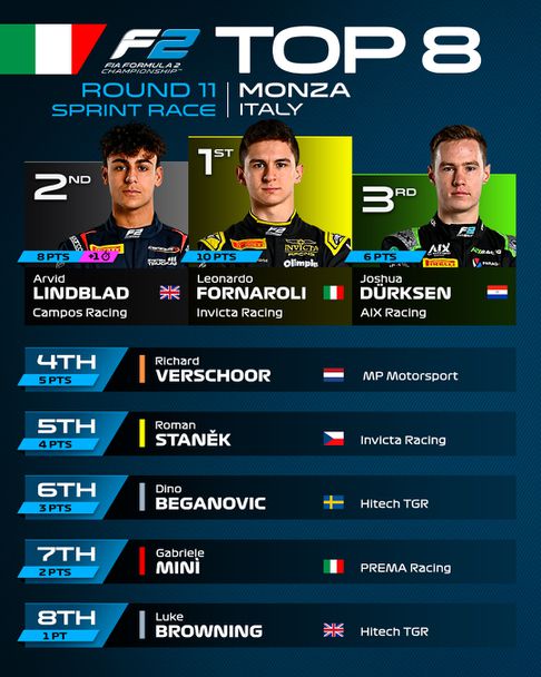Така Форнароли се превърна в първия италианец, който печели в Храма на скоростта във Формула 2 от Лука Гиото, който спечели спринта през 2017 година. Втори зад него завърши Линдблад, а подиума оформи парагваецът Джошуа Дюрксен.