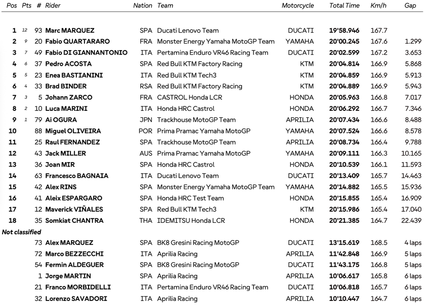В генералното класиране Марк Маркес оглавява подреждането със своя актив от 467 точки и аванс от 187 пред брат му Алекс. Тройката с пасив от цели 239 пункта оформя Франческо Баная, чийто катастрофален уикенд в Каталуния продължи с 14-то място в спринта.