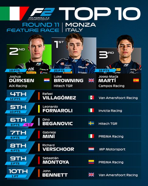 Люк Браунинг спечели своята първа победа във Формула 2, след като триумфира в изпълненото с инциденти основно състезание на пистата „Монца“ в Италия.