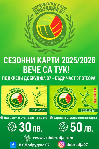 ВК Добруджа 07 (Добрич) пуска 800 сезонни карти, които ще осигуря на притежателите си достъп до всички домакински срещи на отбора във Висшата лига през сезон 20025/2026.