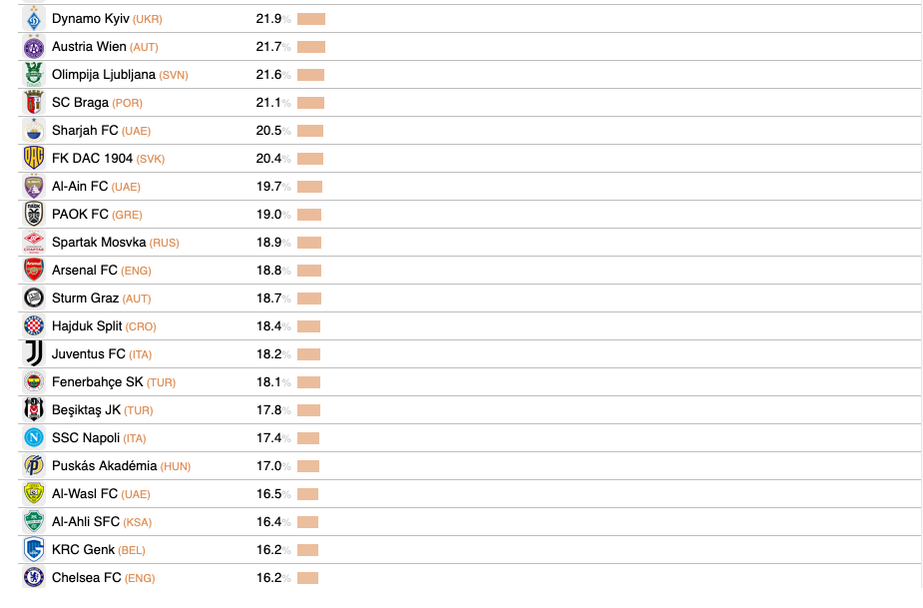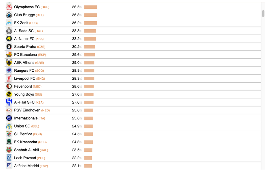 Обратно, сред анализирани първенства най-оспорвани са Про лигата на ОАЕ (максимум 23.5% шанс за успех на Шабаб Ал Ахли), италианската Серия А (25.6% за Интер) и нидерландската Ередивизи (28.6% за Фейенорд).