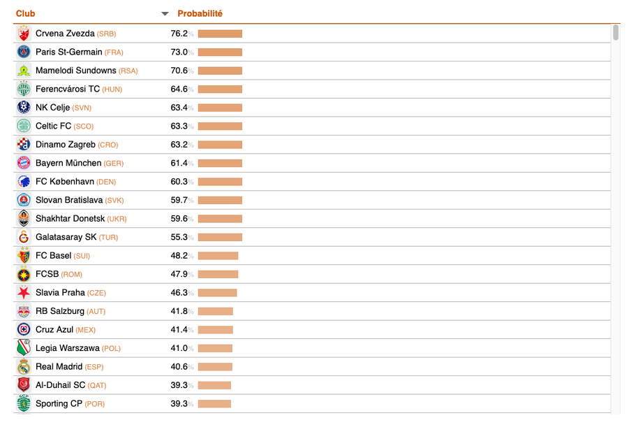 Най-голяма вероятност в абсолютни стойности е отчетена за Цървена звезда да вдигне титлата в Сърбия (76.2%), следван от Пари Сен Жермен за Франция (73.0%) и южноафриканския Мамелъди Съндаунс (70.6%).