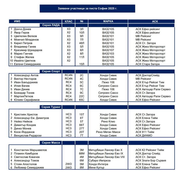 Константин Маршавелов (Мицубиши) срещу Пламен Камбуров (Мицубиши) обещава да е голямата битка в серия Макси на “Писта София 2025” в неделя. Днес бяха публикувани заявките на участниците в състезанието, като право на участие ще получат и тези, които в събота се явят на административния и технически преглед.