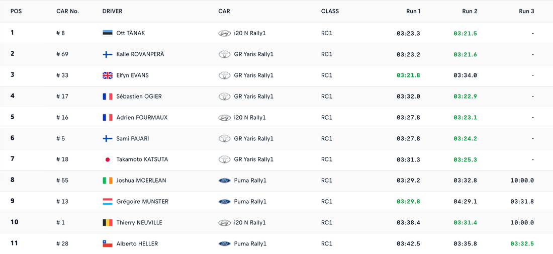 Естонският пилот на Хюндай записа време от 3:21.5 в своето второ минаване на дългата 6.79 километра тестова отсечка в близост до Консепсион. По този начин той изпревари с 0.1 секунда миналогодишният победител в Чили Кале Рованпера с Тойота. Тройката с пасив от 0.3 оформи лидерът в генералното класиране Елфин Еванс, който обаче записа своя най-добър резултат в първото си минаване на шайкдауна, а не във второто, както бе при Танак и Рованпера.