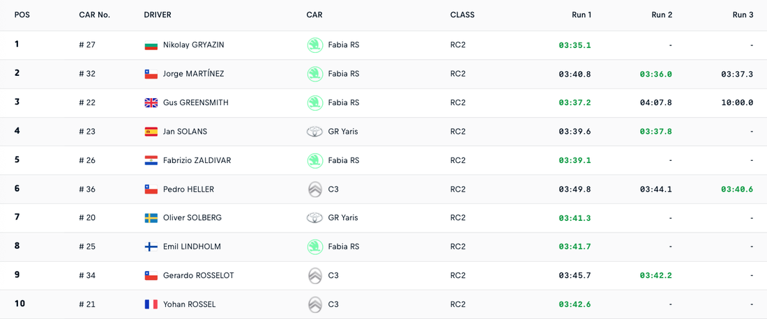 Тройката с пасив от 2.1 оформи Гас Грийнсмит, а зад него в топ 5 влязоха още Ян Соланс и Фабрицио Салдивар, които изостанаха със съответно 2.7 и 4.0 от Грязин. Големият фаворит за победата в Чили, а и за световната титла в WRC2 Оливър Солберг остана седми на 6.2 Грязин и също мина само веднъж през шейкдауна.