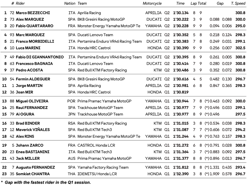 От втория ред на „Мизано“ ще потеглят лидерът в генералното класиране Марк Маркес, Франко Морбидели и Лука Марини, който в самия край се изкачи на шестото място. Зад тях Фабио Ди Джанантонио, Баная и падналият Педро Акоста ще оформят третата редица, а в дъното на класирането във втората фаза на квалификацията останаха Фермин Алдегер, Мартин и Жоан Мир.