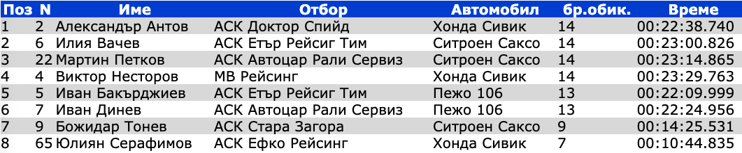 На финала Антов спечели с аванс от малко над 22 секунди пред Вачев, а трети на 36 секунди зад победителя остана Мартин Петков, също със Ситроен Саксо. Покрай карирания флаг минаха още Виктор Несторов (Хонда Сивик), Иван Бакърджиев (Пежо 106) и Иван Динев (Пежо 106).