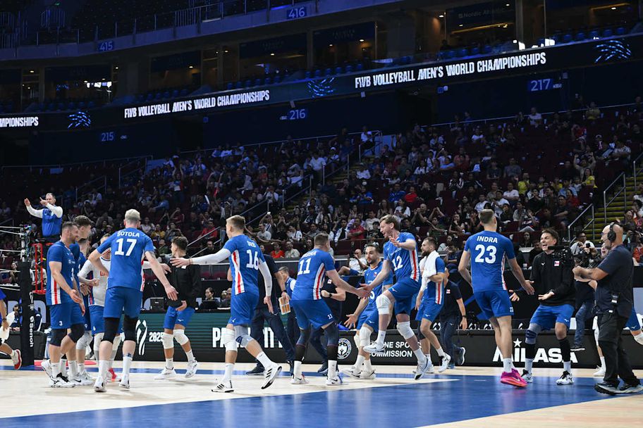 Волейболистите от националния отбор на Чехия започнаха с отлична победа участието си на Световното първенство във Филипините. Воденият от треньора Иржи Новак тим изненада Сърбия и го надигра с 3:0 (25:22, 25:23, 25:20) в първата си среща от Група Н на турнира, играна този следобед пред около 3500 зрители в залата на SM Mall of Asia в Пасай Сити.