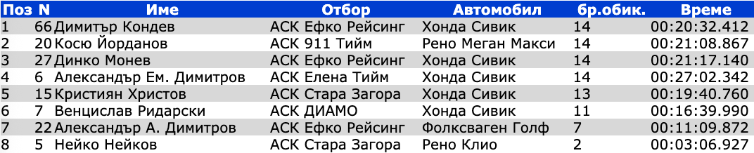 Пилотът на АСК Ефко Рейсинг беше безкомпромисен по дистанцията от 14 обиколки и пресече финалната линия с аванс от 34.4 секунди пред втория Косю Йорданов с Рено Меган Макси. Така след наказанието на Кондев неговият краен аванс стана 19.4 секунди, което си е повече от убедителна победа.
