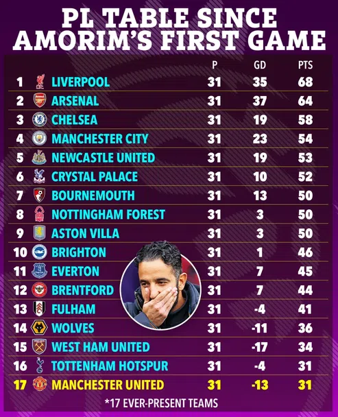 Португалецът застана начело на “червените дяволи” на 24 ноември 2024 г. и до момента е извел състав в 31 кръга от Премиър лийг. Ако под внимание се вземат резултатите на всички отбори, които са в елита от въпросната дата досега - т.е. 17 отбора, то се вижда, че Юнайтед е на последно място с 31 точки. За това време Аморим е спечелил само 8 срещи, а головата разлика на отбора е минус 13, отбелязва “Сън”.