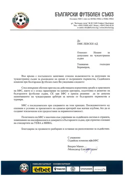 „След извършен обстоен преглед на действащата нормативна уредба и практиката на БФС, както и с оглед гарантиране на единни критерии, подготовка и развитие на българските футболни съдии, СК при БФС е приела решение да не допуска назначаването на чуждестранни арбитри за мачове от българските първенства и турнири.“