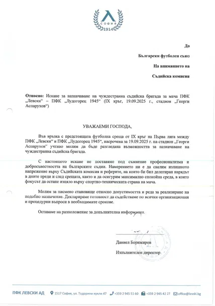 На 10.09.2025 ПФК „Левски“ изпрати официално запитване до Съдийската комисия към БФС относно мача срещу ПФК „Лудогорец 1945“ на 19.09.2025 г., с което потърси и възможности за диалог по темата чуждестранни съдии за определени ключови срещи в българския шампионат.