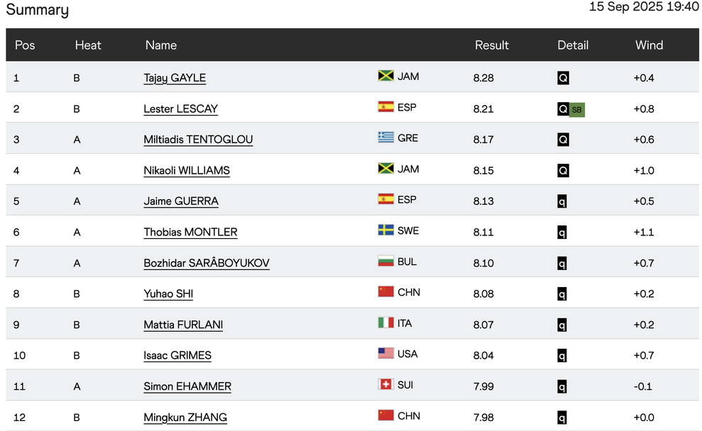 Извън финала останаха бронзовите медалисти от последните две световни първенства в зала Лиам Адкок (7.94 м) и Кери Маклауд (7.86 м).