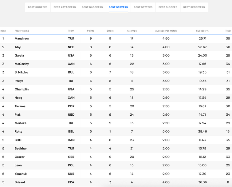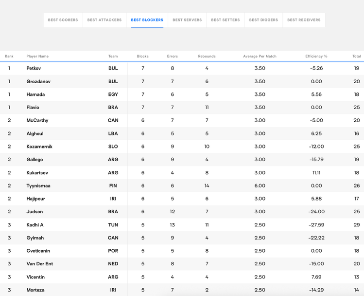 И двамата имат по 7 блокади - средно 3.50 на мач. Бразилецът Флавио Жуалберто също е третият състезател със същия брой точки от елемента.