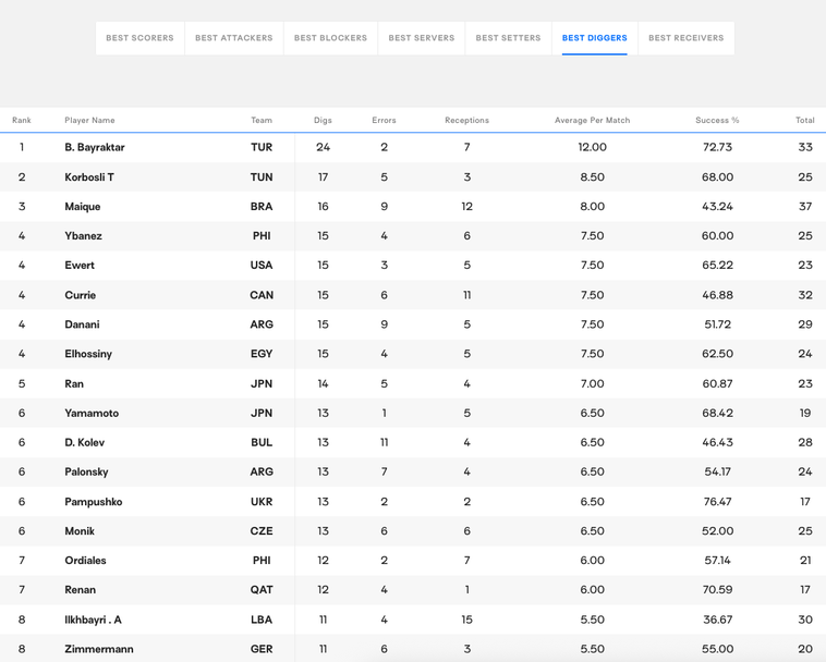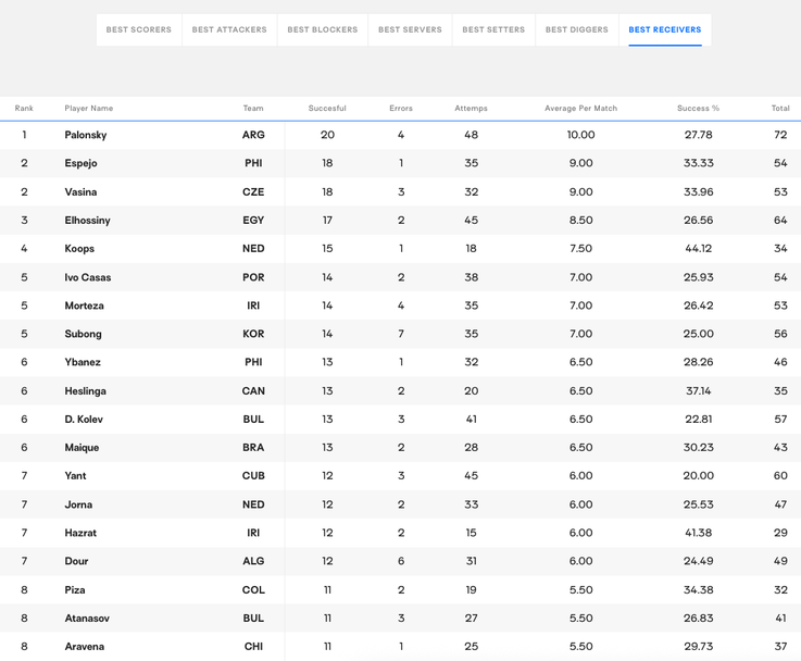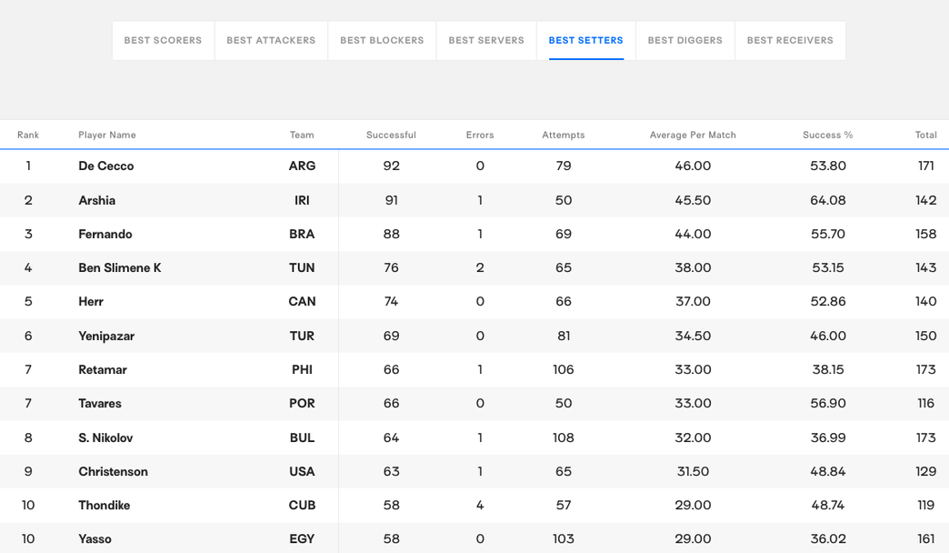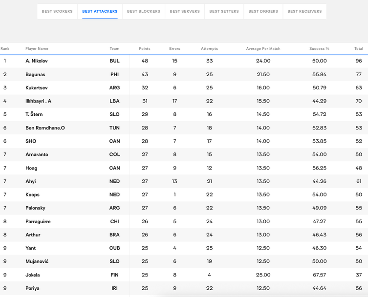При разпределителите Симеон Николов е осми с 64 успешни подавания (средно 32 на мач), или 36,99 % ефективност.