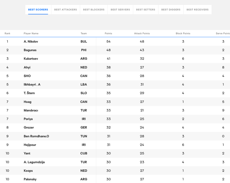 Николов е №1 при най-резултатните състезатели с 54 точки (3 аса, 3 блокади).
